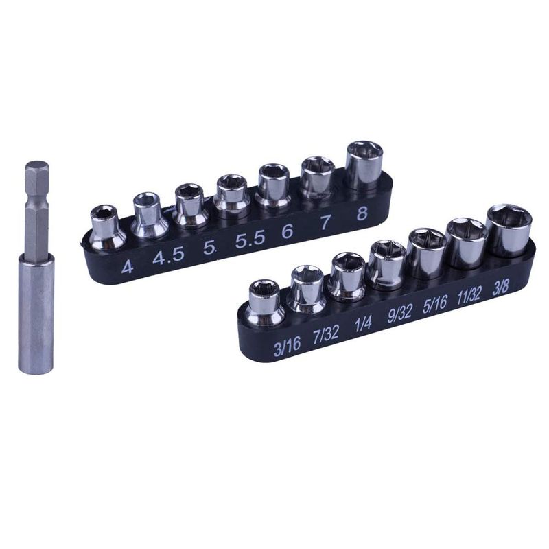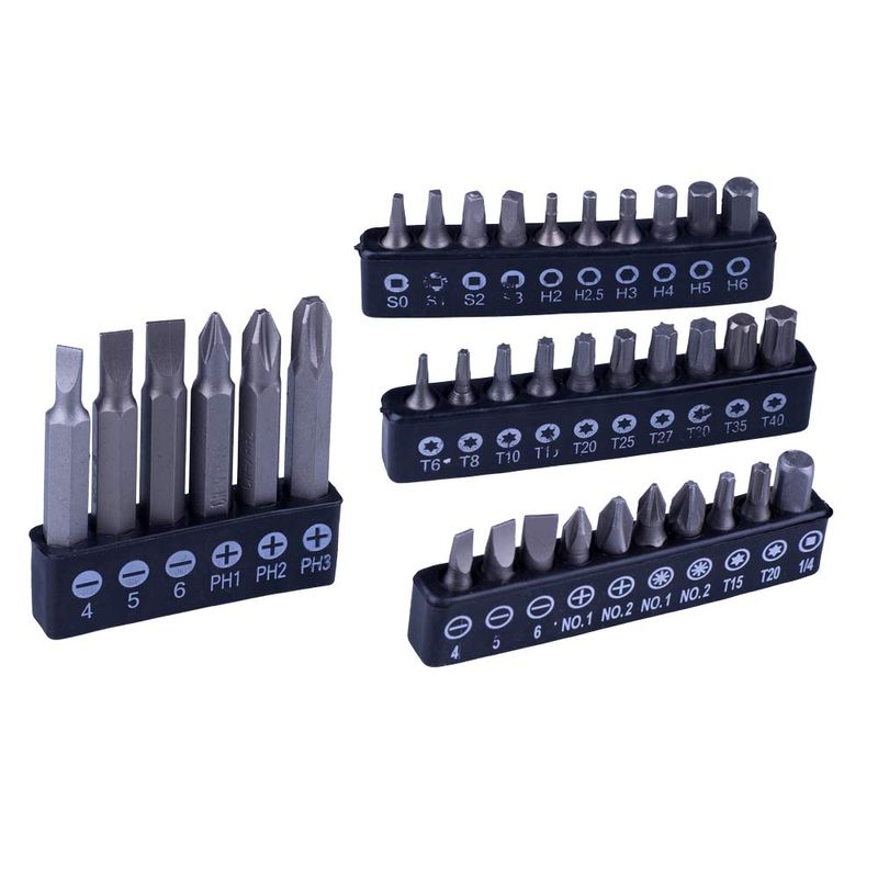 30 bits fenda 25mm, 6 bits fenda 50mm, 14 soquetes 1/4, Porta bits, Chave catraca, Cabo adaptador