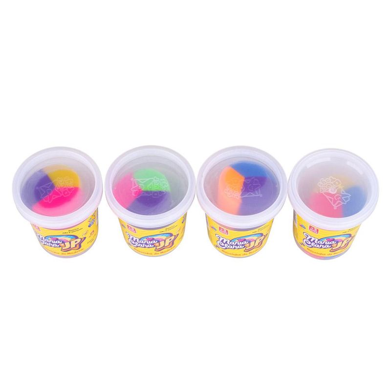A Massinha de modelar maria clara E jp é a primeira fabricada no Brasil, são 4 cores diferentes no mesmo potinho os irmãos mais amados do youtube juntamente com A massinha mais moderna do Brasil. A linha Maria Clara E jp é mais um produto da diver massa. A linha de massinhas da Divertoys. Não gruda, não mancha, não solta tinta massinha com textura excelente atóxica, certificada com selo de segurança do inmetro.