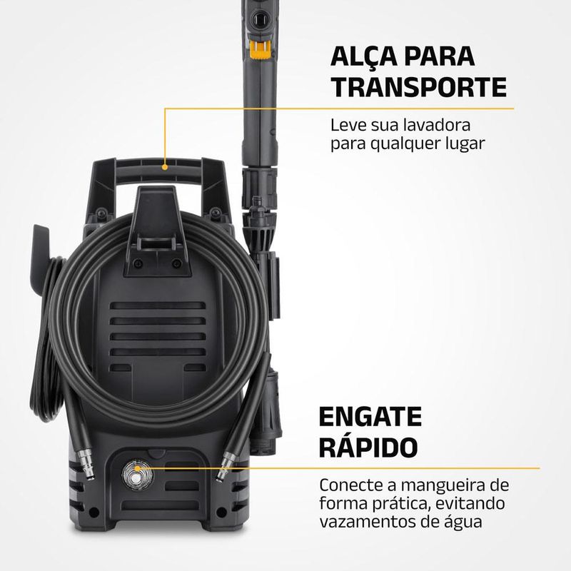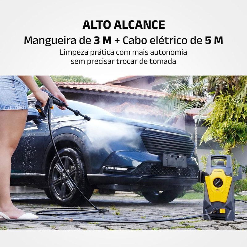 Mobilidade e praticidade: cabo elétrico de 5 m e mangueira de 3 m garantem maior alcance, além de alça para transporte.
