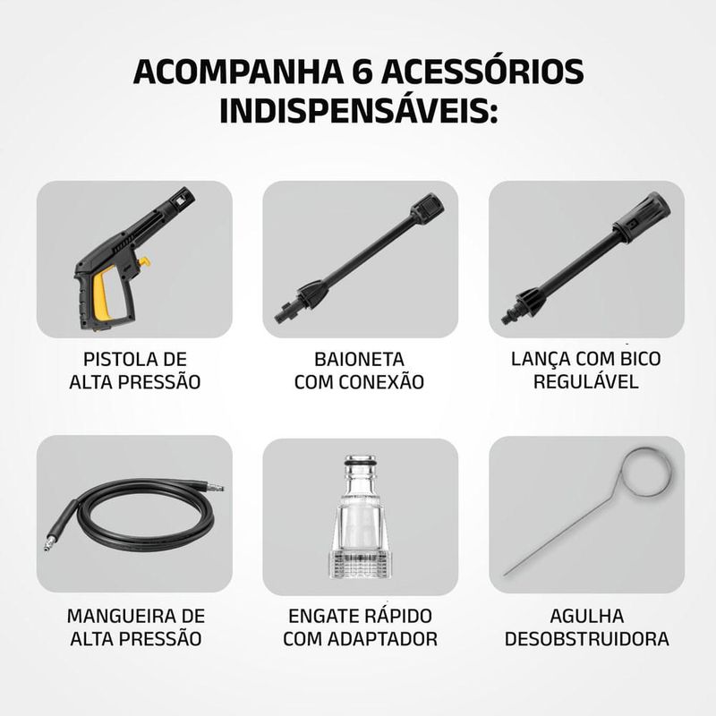 Acessórios inclusos: lança com bico regulável, engate rápido, agulha de desobstrução, pistola de alta pressão, mangueira, baioneta com conexão rápida.