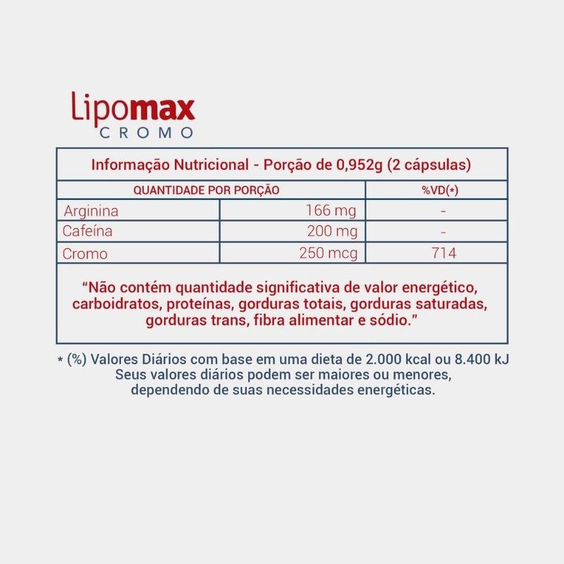 A nova fórmula de Lipomax agora ainda melhor. Lipomax Cromo é indicado para emagrecimento, sua fórmula exclusiva com picolinado de cromo, cafeína e arginina ajuda a diminuir o apetite, proporcionando sensação de saciedade. Indicação: Combate ao Sobrepeso. Princípios Ativos: PICOLINATO DE CROMO, CAFEÍNA, ARGININAModo de Uso: 1 cápsula 30 minutos antes do almoço e jantar.
