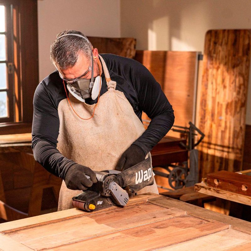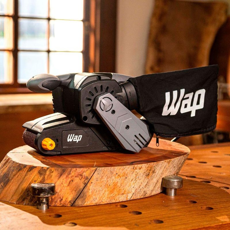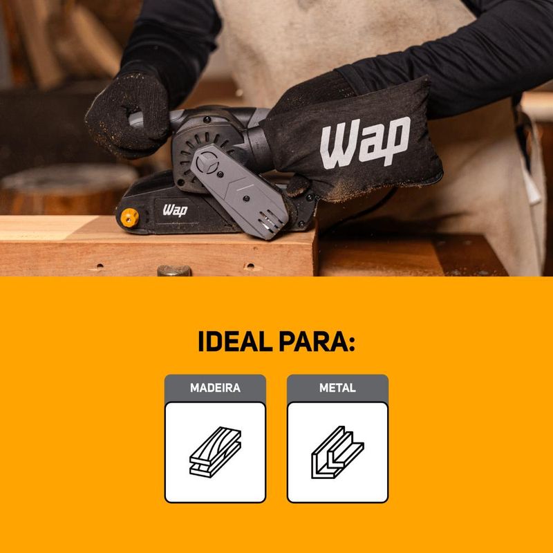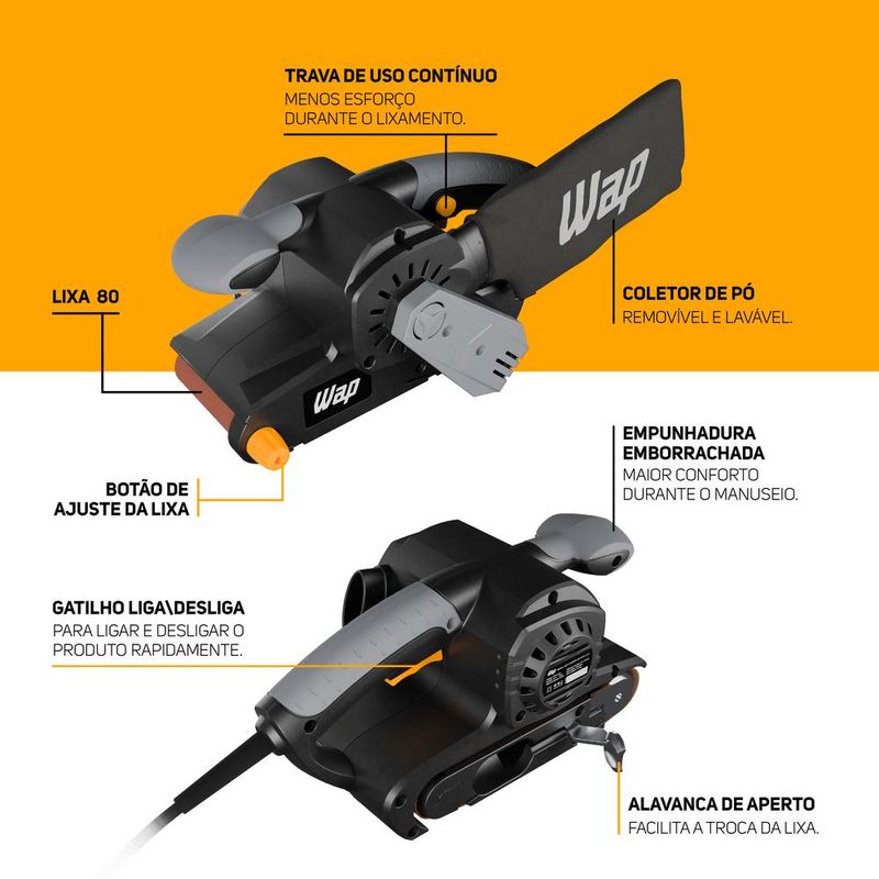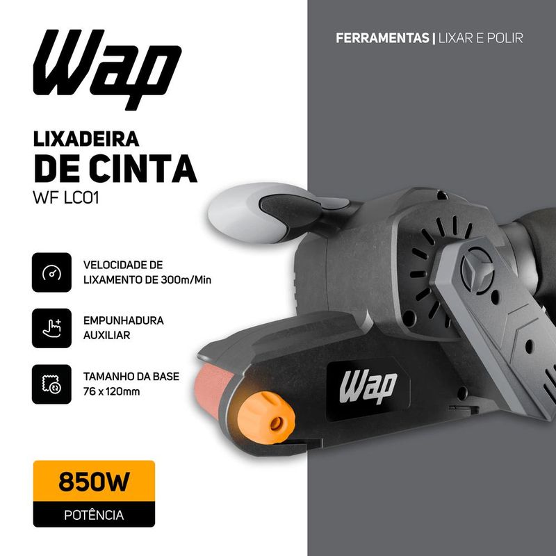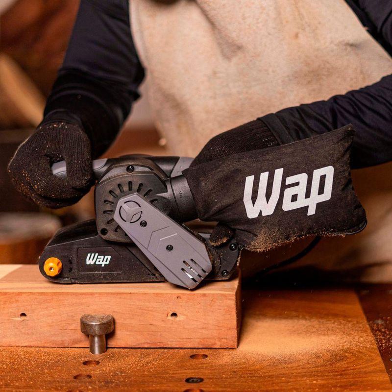 - A Lixadeira de Cinta WAP acompanha um coletor de pó lavável e uma lixa 80.