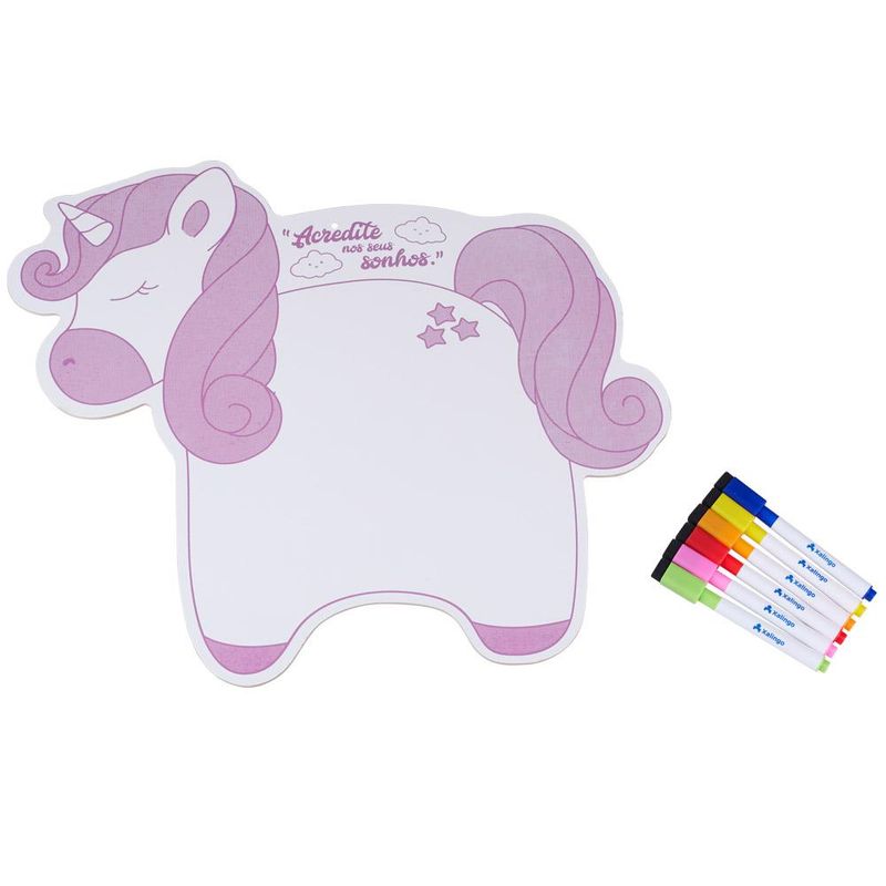 O Quadro Unicórnio com Canetinhas Xalingo você vai desenhar e pintar ficou mais divertido com o Quadro Infantil Unicórnio Xalingo Brinquedos em madeira reflorestada e um kit de canetinhas coloridas com um apagador na tampa possibilitando à criança desenhar e apagar quantas vezes quiser. Contribui para habilidades da escrita, estimulando a coordenação motora, a criatividade e imaginação. Recomendado para crianças acima de 3 anos.