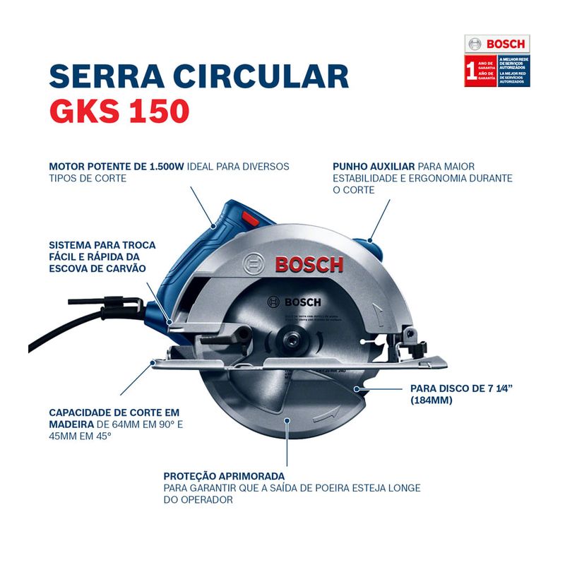 A Serra Circular Bosch GKS 150, com 1500W de potência, é ideal para as principais aplicações e com um preço que cabe no seu bolso. Conta com recurso contra travamento para maior segurança, além de punho auxiliar robusto que garante maior estabilidade durante o corte. O pó fica longe do usuário graças a sua saída de pó eficiente. As escovas de carvão são facilmente acessadas, fazendo com que sua troca seja simples e fácil. Pronta para usar, acompanha 1 disco de serra de 24 dentes, guia paralelo e prática bolsa de transporte.